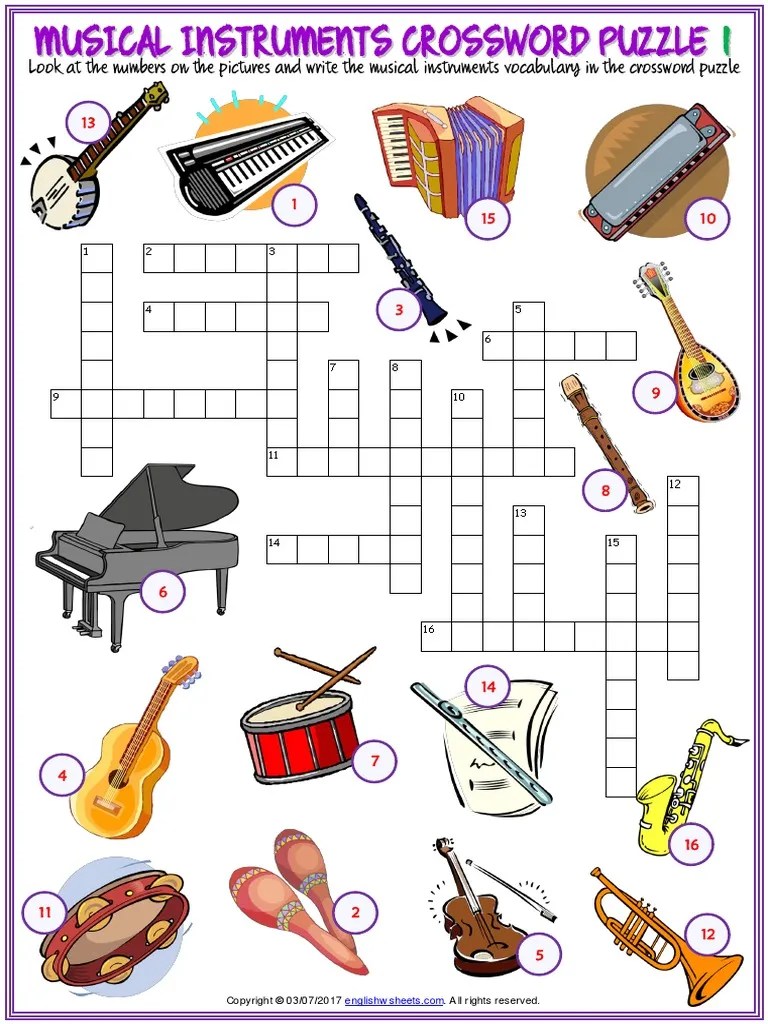 Musical Instruments ESL Crossword Puzzle Worksheet for Kids Music