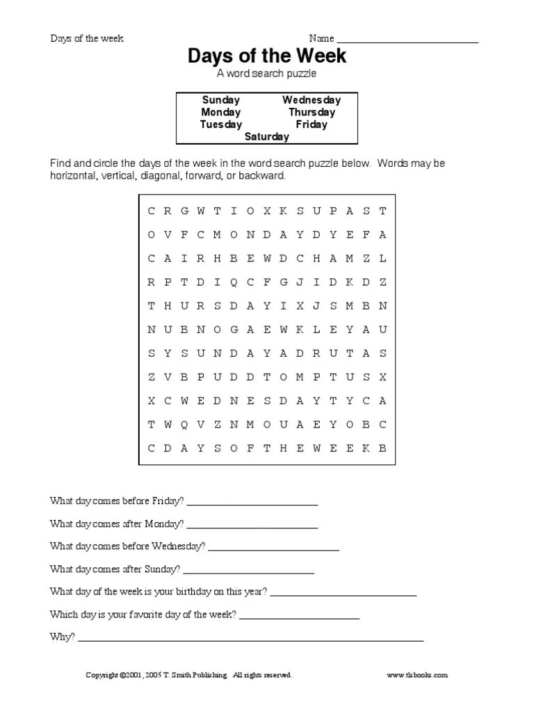 Days of The Week Crossword PDF